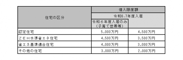 子育て世帯等が令和6年に入居する場合は、借入限度額が次のとおり上乗せされます。